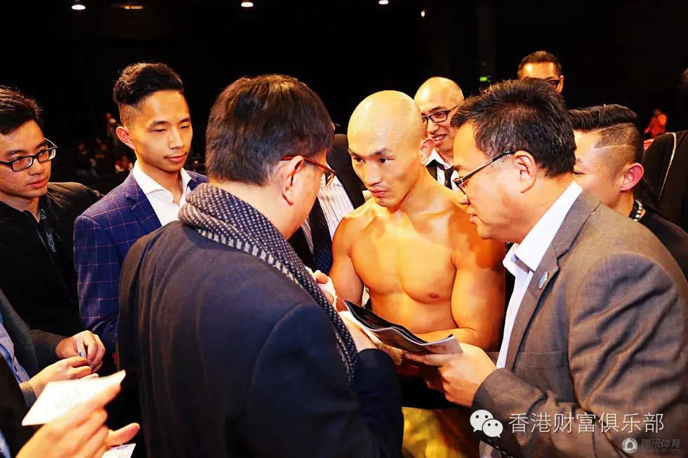 现场拳迷16万人民币拍得一龙签名拳套做公益。 (来自:腾讯体育)