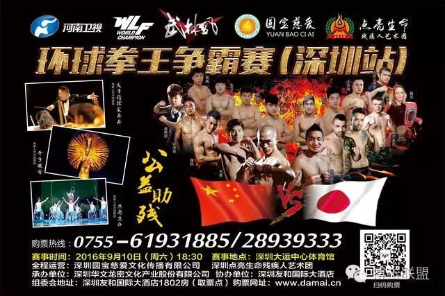 2016年9月10日由武林风、圆宝慈爱、点亮生命环球拳王争霸赛深圳站,在可容纳一万八千人的深圳大运中心体育馆举行,“中国梦,慈爱行”,公益助残,这是一场世纪之战,更是一场公益赛事!