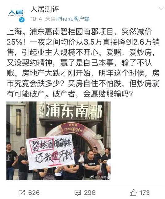 其实,对于那些买了房子后,结果新买的房子却便宜的人,不管目的是为了自住,还是谋利,拿钱投入房产,都无可厚非。说实话,我也打心里愿意支持房价低了可以通过聚众上访等方式找回差距,因为这样的话,我也可以高枕无忧的去投资到房产,毕竟有人为自己的商业行为兜底。当然,别说是现在,即便多年前,也没人为你的商业行为兜底的。包括楼盘降价引发纠纷,包括很多官员十八大后照收红包,包括很多人继续为人“打保护伞”,告诉你们一句:别拿历史看今朝。
