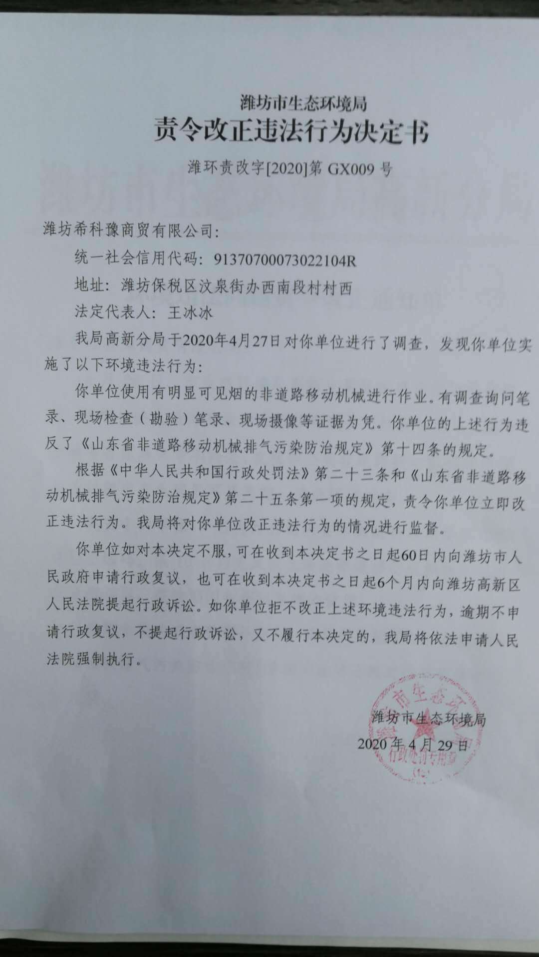 2020年4月26日,潍坊市生态环境局根据群众投诉举报情况,组织执法人员对潍坊某公司垃圾转运站、废险废物暂存库异味专项检查,发现潍坊希科豫商贸有限公司非道路移动机械铲车在作业过程中产生明显黑烟,造成环境污染。责令企业改正违法行为,1 并处罚款5000元。(潍坊广播电视报今日头条客户端5月7日)