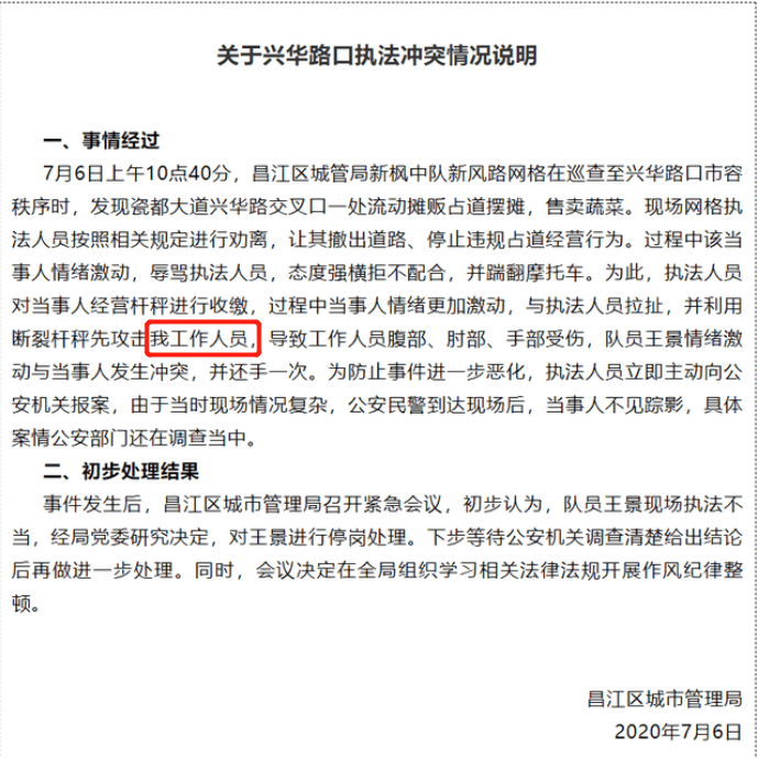 事件发生后,昌江区城市管理局召开紧急会议,初步认为,队员王景现场执法不当,经局党委研究决定,对王景进行停岗处理。下步等待公安机关调查清楚给出结论后再做进一步处理。同时,会议决定在全局组织学习相关法律法规开展作风纪律整顿。(界面新闻百度客户端7月6日)