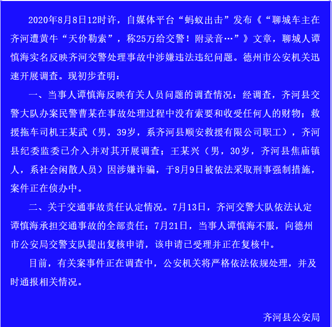 2020年8月8日12时许,自媒体平台“蚂蚁出击”发布《“聊城车主在齐河遭黄牛“天价勒索”,称25万给交警!附录音…”》文章,聊城人谭慎海实名反映齐河交警处理事故中涉嫌违法违纪问题。德州市公安机关迅速开展调查。现初步查明: