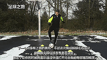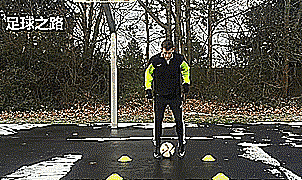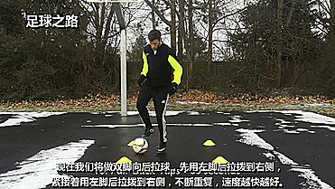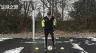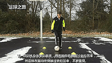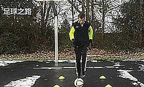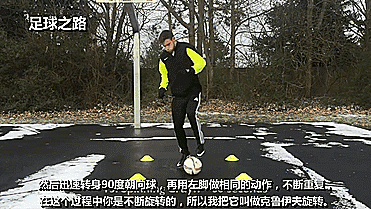 第十一项 克鲁伊夫转身(自命名)这个动作会稍微复杂一点,我把它称之为克鲁伊夫旋转。先用你的右脚向身后拉球,拉到腿后,立刻轻推到另一侧,然后迅速转身90度朝向球,再用左脚做相同的动作,不断重复,在这个过程中你是不断旋转的,所以我把它叫做克鲁伊夫旋转。