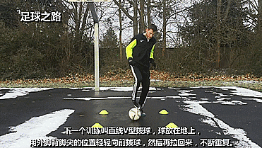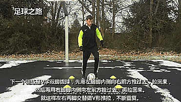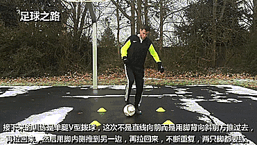 第七项 单腿V型拨球这次不是直线向前,而是用脚背向斜前方推过去,拉来回来,然后用脚内侧推到另一边,再拉回来,不断重复,两只脚都要练;