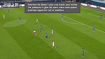 接球后,他并没有一脚传球,而是先主动吸引对手火力,为队友创造出更多的空间。