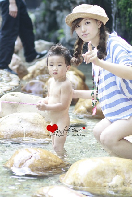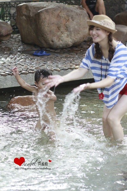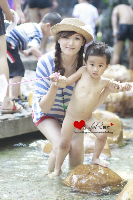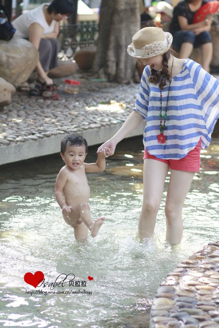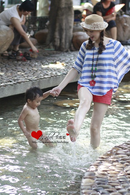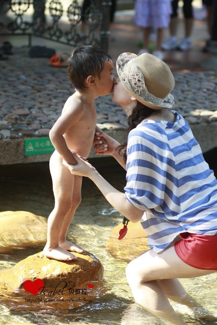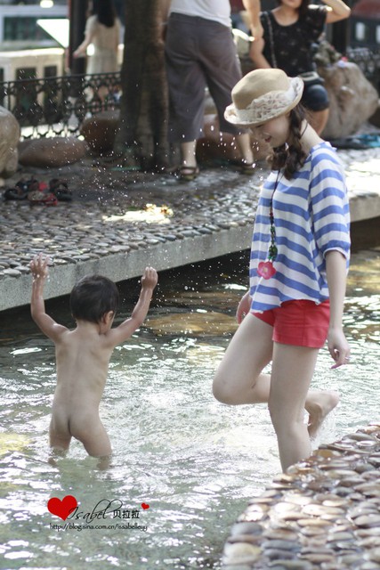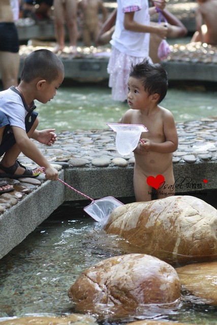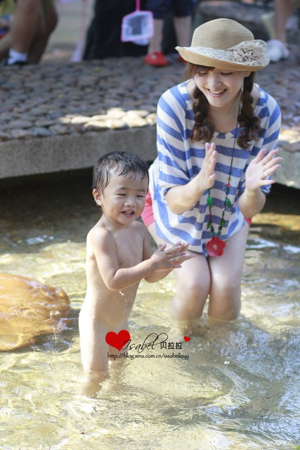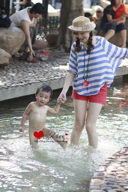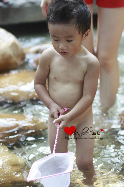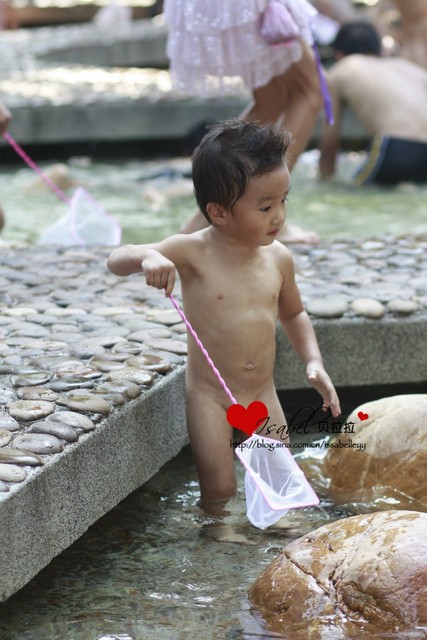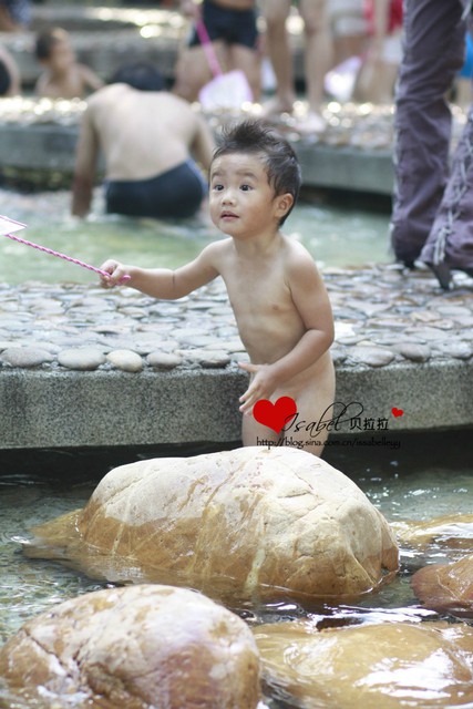 谁知水位对天天来说已经过了膝盖,又看到周围的3岁以下的小男孩基本都在裸奔,哈哈,于是也把天天给扒光了~