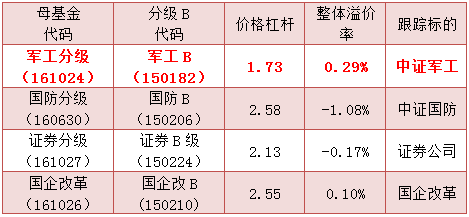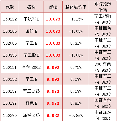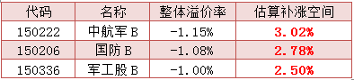1.军工板块全线暴涨,杠杆倍数较高的中航军B、国防B、军工股B由于涨停板的阻挡,未能涨到合理位置而尽显被动整体折价,这意味着若明日军工板块横盘开盘,这三只B基或仍要继续上涨。
