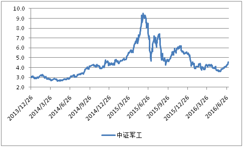 其次,在短期市场乐观阶段,军工历来都是最好的“弹性之矛”。这意味着军工常如分级B一般,“拉号角、猛冲锋”本就是其自身特点。加之军工板块当下估值处于三年来较低水平、消息面上又有今日日方向我军挑衅、军民融合发展空间巨大、南海仲裁案7月12日公布裁决等,“向下弹性较小、向上弹性又大”的军工或许还有动人机会。