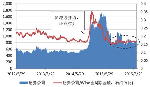 其次,我们拉长焦距看证券相对大盘的走势,近期其也处在一个极其不合理的空间。客官们从下图可以看到,从2012年以来,证券板块相对大盘都存在超额收益,但近期例外,两者同涨同跌,算得上有点反常。