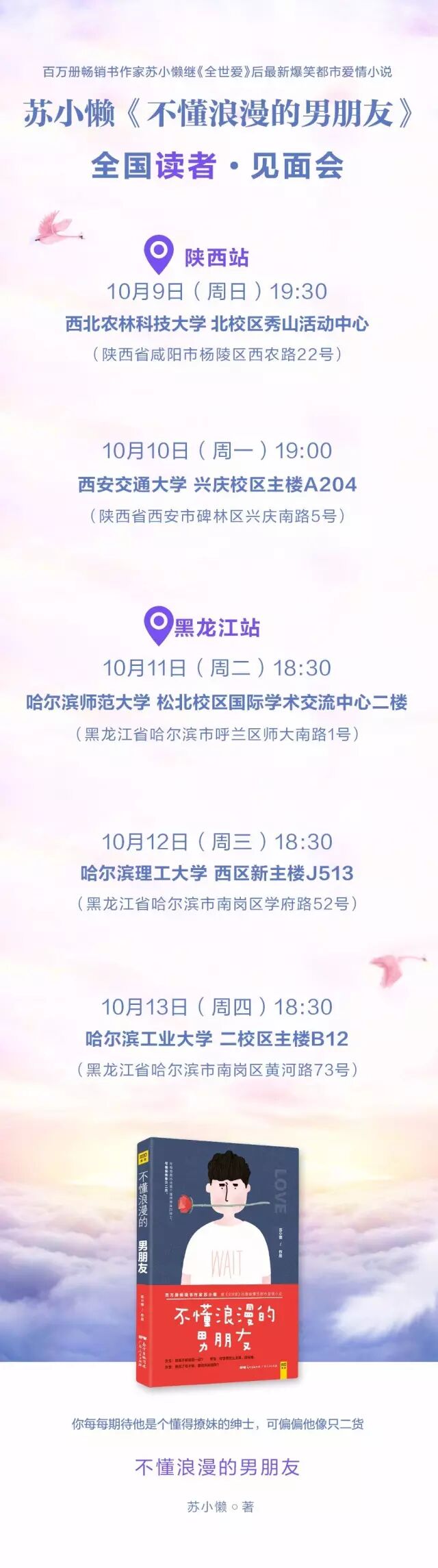 接下来的日子里苏小懒将在哈尔滨等城市继续新书分享活动,正如她在《不懂浪漫的男朋友》后记中所说“我们总是等着你的”,是的,我们总是等着你的,你呢?