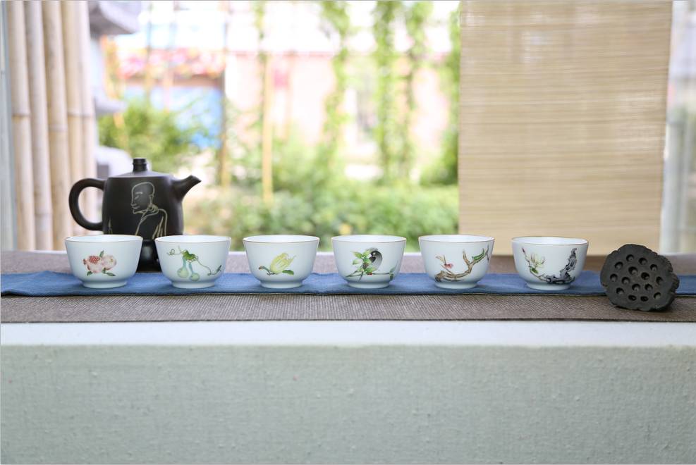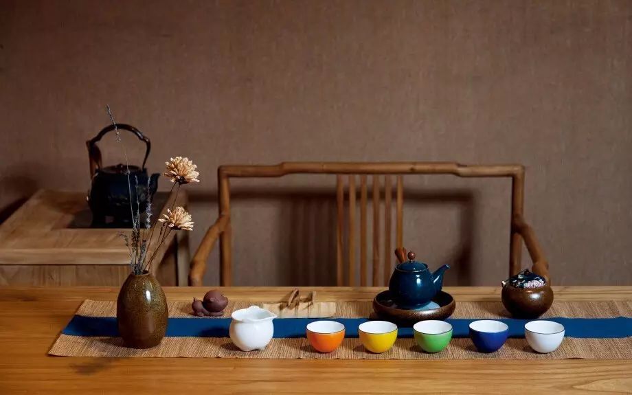 茶具的色泽是指制作材料的颜色和装饰图案花纹的颜色,通常可分为冷色调与暖色调两类。冷色调包括蓝、绿、青、白、灰、黑等色,暖色调包括黄、橙、红、棕等色。凡用多色装饰的茶具可以主色划分归类。茶器色泽的选择是指外观颜色的选择搭配,其原则是要与茶叶相配,茶具内壁以白色为好,能真实反映茶汤色泽与明亮度,并应注意主茶具中壶、盅、杯的色彩搭配,再辅以船、托、盖置,力求浑然一体,天衣无缝。最后以主茶具的色泽为基准,配以辅助用品。