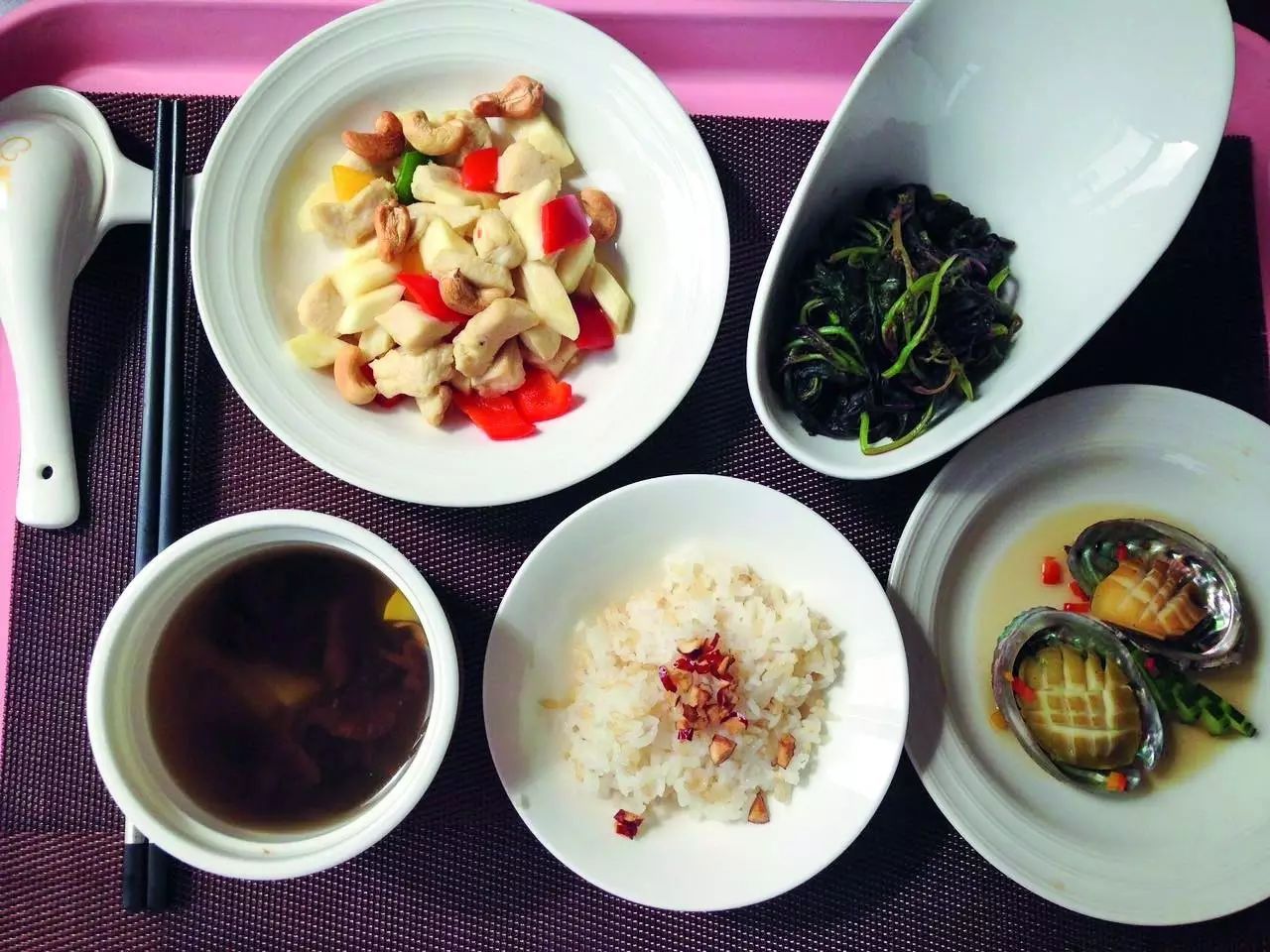 清蒸鲍鱼、腰果炒鸡丁、炒空心菜、红枣杂粮饭、杜仲乌骨鸡汤