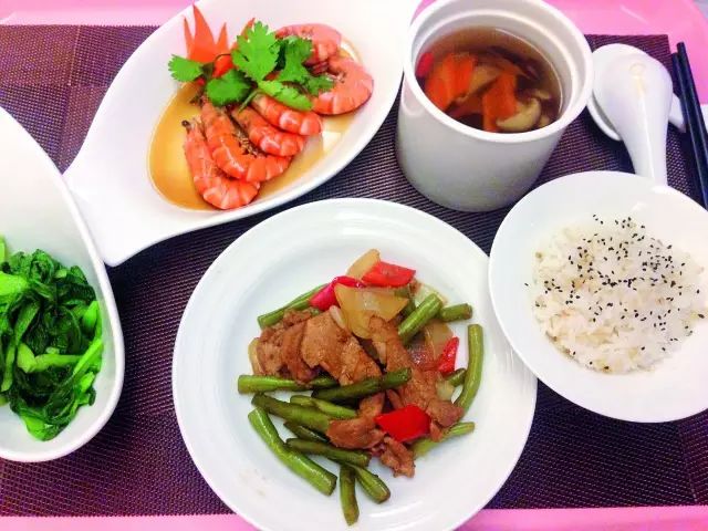 台式草虾、时蔬炒牛肉、青菜、芝麻杂粮饭、胡萝卜木耳浓汤