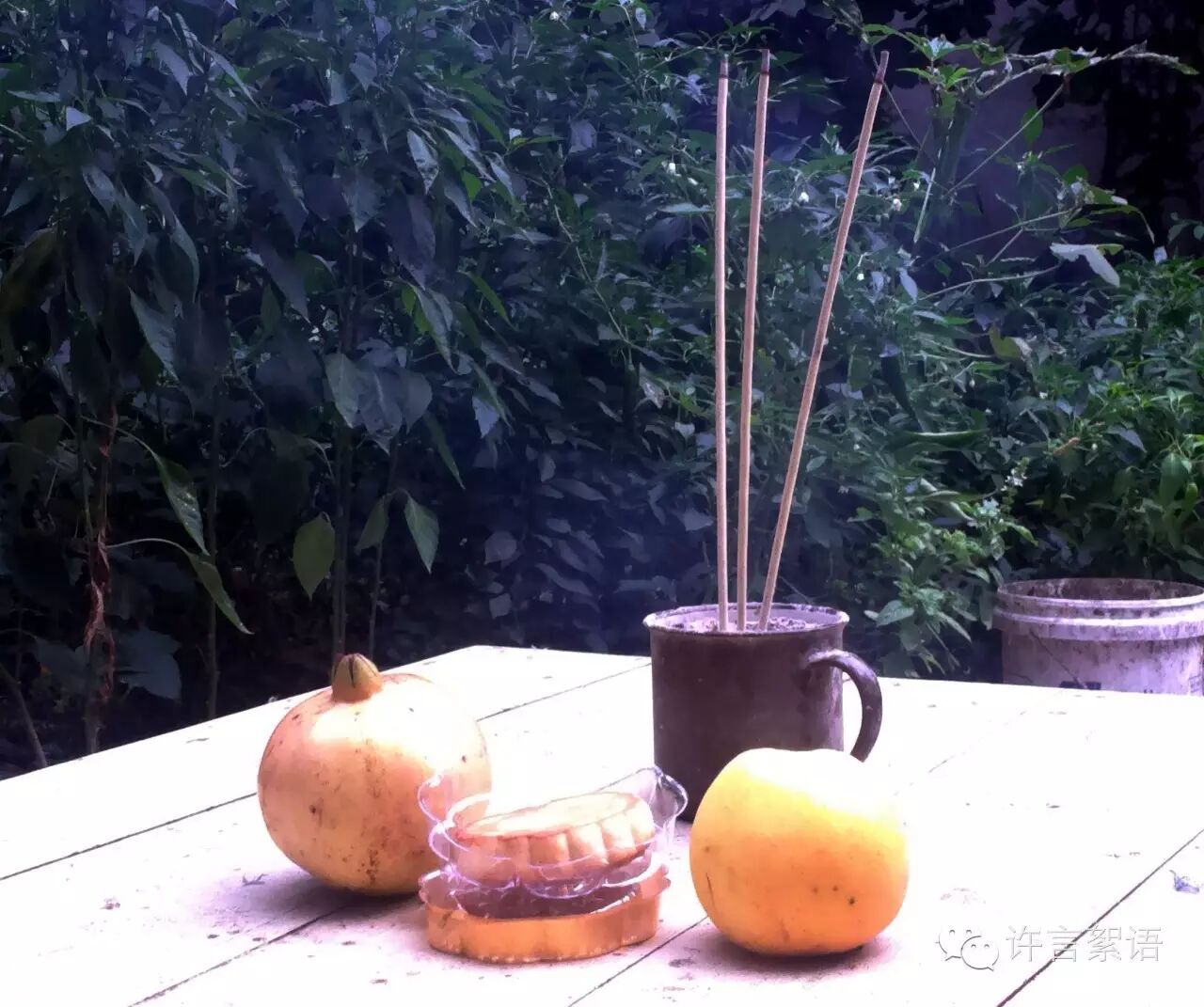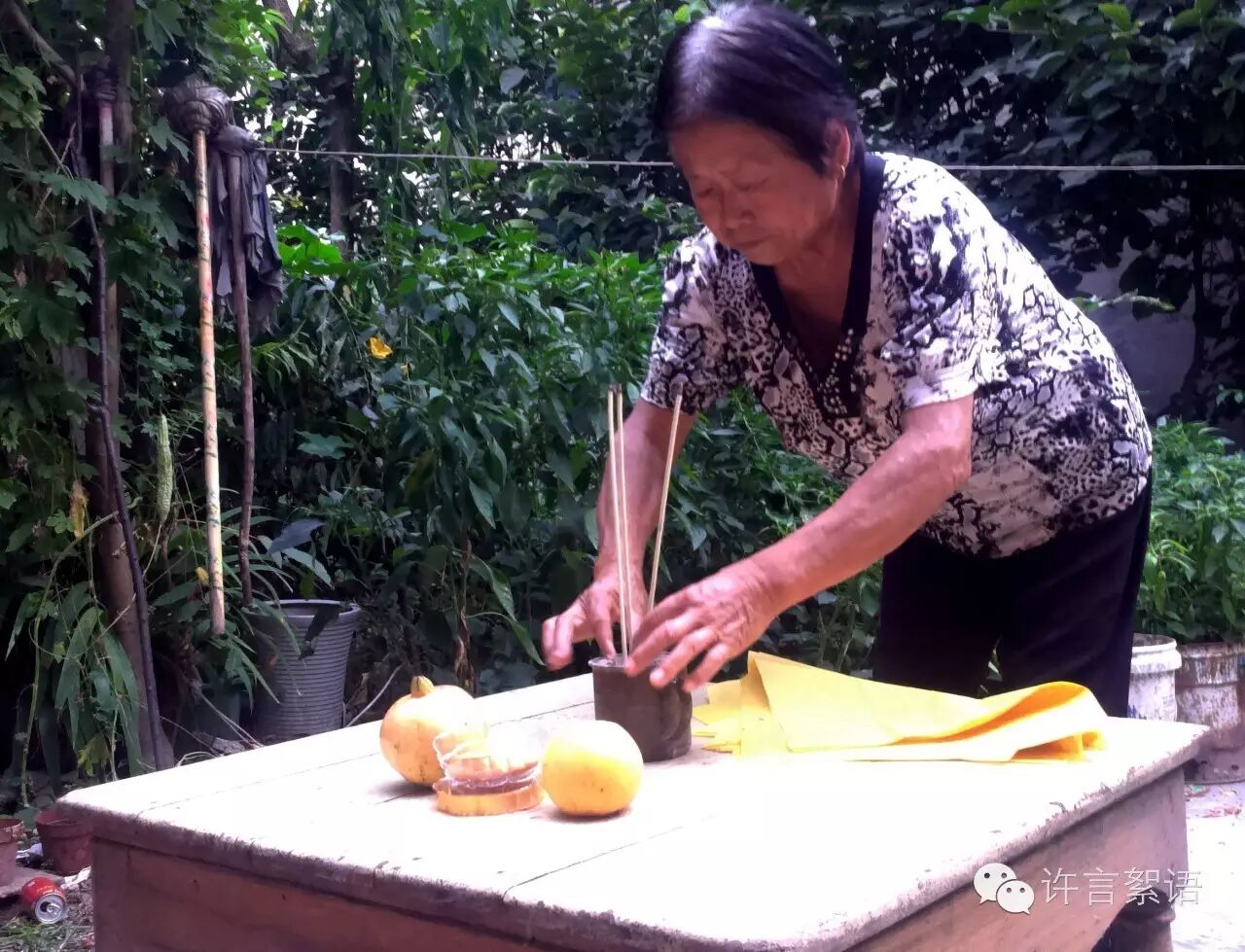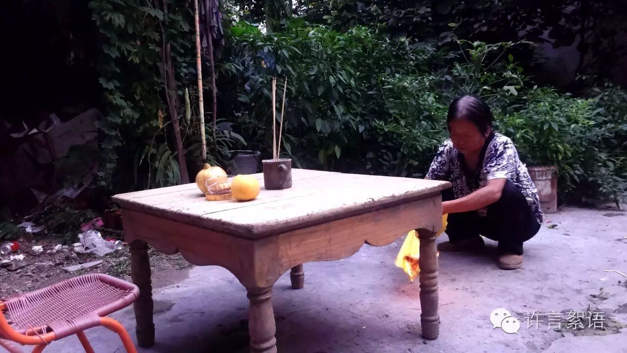 6点多的时候,妈妈将小方桌摆放在小院的正当中,拿出一块月饼和一个苹果、一颗石榴整齐地摆放在小桌上。苹果象征着平安,石榴象征着多子多福,月饼则是象征着团圆和甜蜜。一个陶瓷茶缸当做香炉,三柱香、几张黄表纸。桌子的北边放着一把小椅子,妈妈说这个座位是月奶奶的。准备齐当后,妈妈便让妻子开火煮饺子,她则站小桌子的前面焚香烧纸,虔诚地祈祷着月奶奶保佑家人平安幸福。在拜月的时候,由于妈妈的身体常年有病,腿也不好难以下跪,妈妈便蹲在地上,吃力地向着北方磕了三下头。