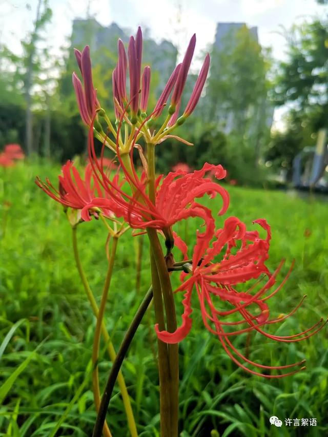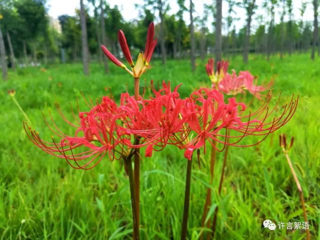 那个时候,由于信息流通的不发达,网络还不能像现在一样用什么软件一搜,就能查出来百科知识。或许是人民见惯了红花配绿叶的常态,乍一见到光秃秃的花朵没有一片绿叶陪伴,这朵花还是那么的妖艳,还是那么地透漏着邪恶,人们不由得就会产生狐疑,产生联想,产生天降异象的幻觉。这实在是可以理解的。而今,绿化植物的多元化和信息传递的便捷化,让人们接受信息和获取信息更加便捷,接触到的未知的知识,无需大惊小怪,手机一扫或者一搜便能解疑释惑了,故此,妖艳的彼岸花虽然在这里肆意开放,似乎并没有引起太多人们的惊奇和关注。