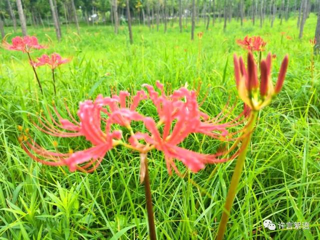突然,一片鲜艳的彼岸花映入眼帘,鲜艳、妖娆、热烈、奔放的花朵,让人惊喜、让人惊艳。停下来,走进花丛,拿起手机尽情地欣赏、拍照。鲜艳的花和绿色的草,完美的搭配。不知道是绿色的小草衬托了鲜艳的花,还是鲜艳红火的花点缀了绿色的草,总之,红配绿的醒目和简单明了,让人不舍离去。