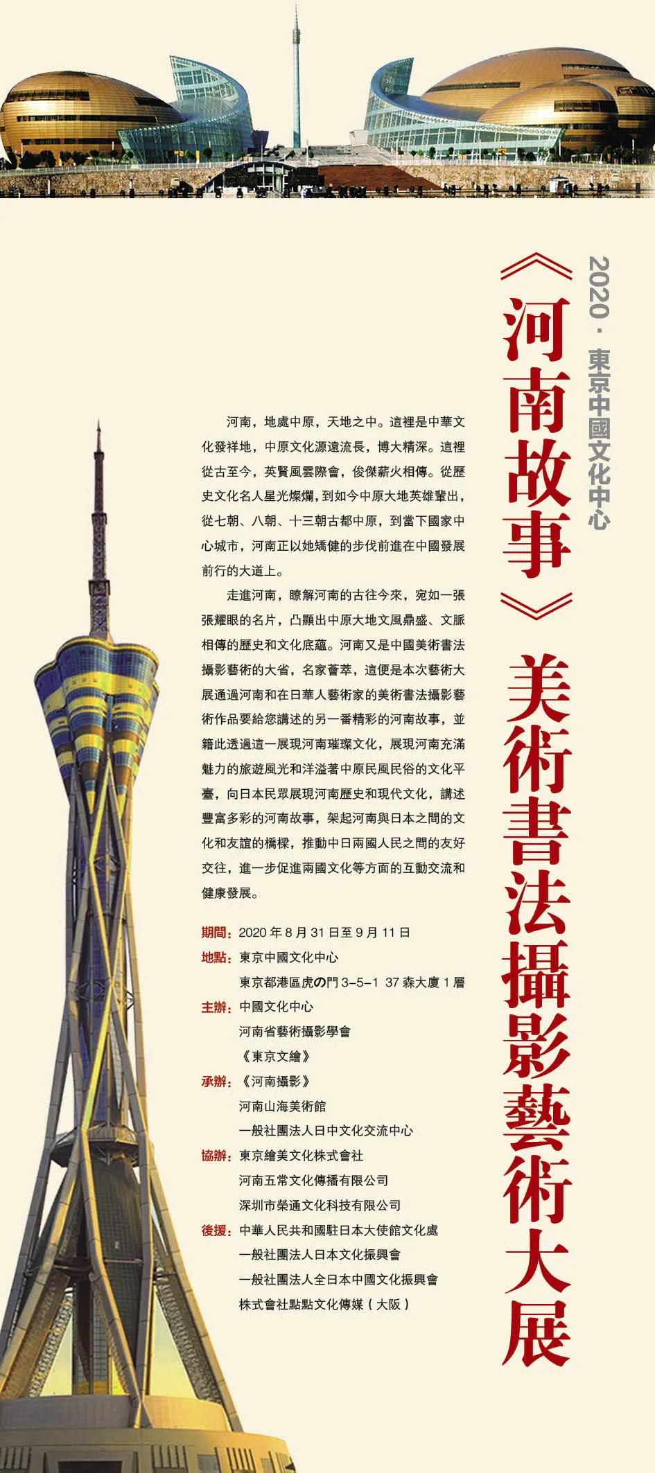 2020年8月31日下午3时,隆重的剪彩仪式拉开了在东京中国文化中心举办的“《河南故事》美术书法摄影艺术大展”的序幕。