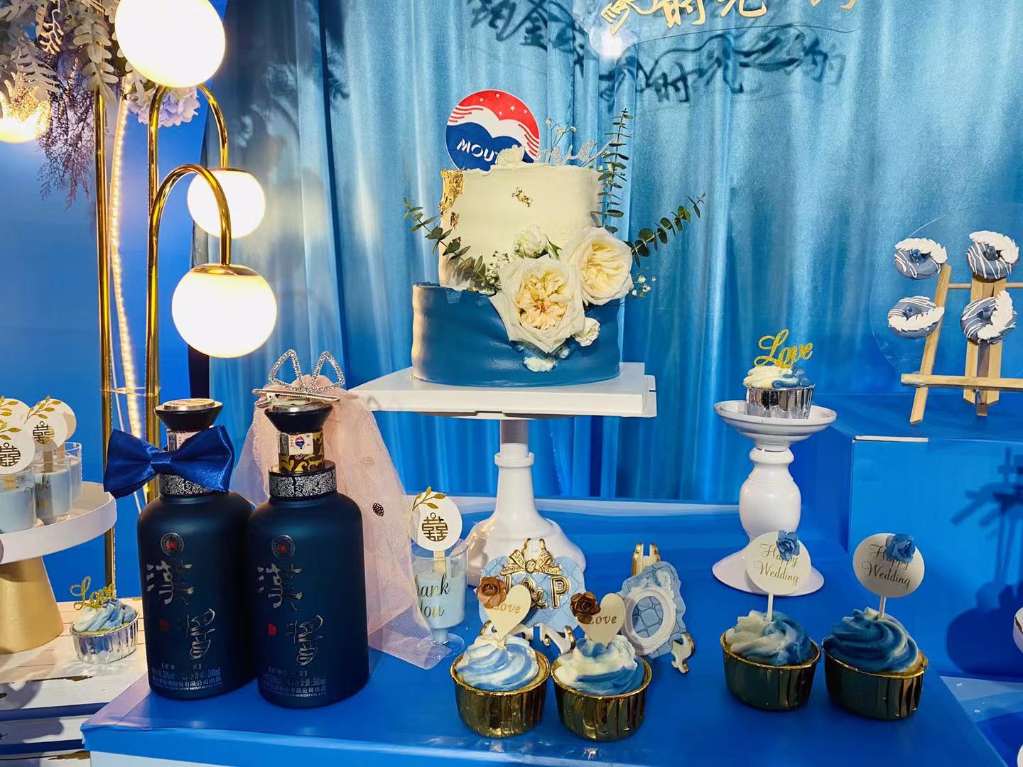 包装设计上,完全采用包括汉代琉璃蓝、青龙玉佩纹、马王堆帛书、汉代士大夫衣襟纹络等汉代传统元素设计,却展现出了一派现代时尚商务的气韵。蓝色也象征着爱情,在婚礼现场与西式婚礼的白、蓝等色彩交相辉映,分外具有质感。
