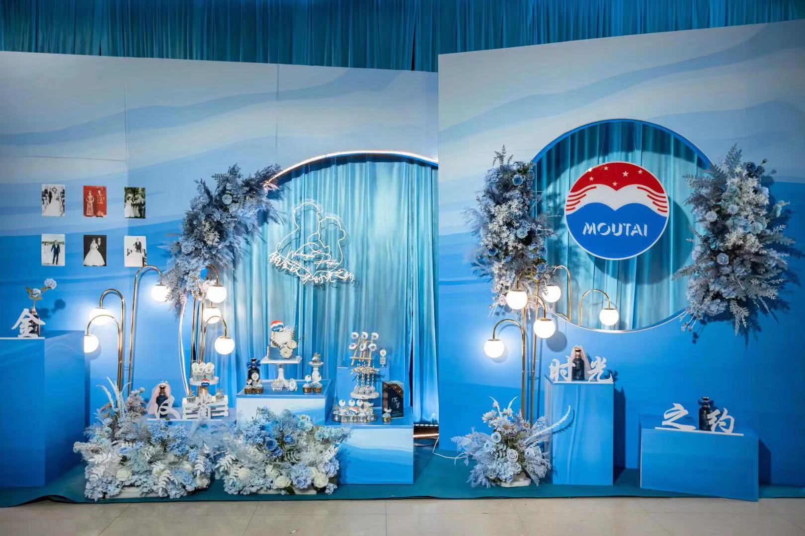 婚礼上,到场的宾客都被这一抹清新又浪漫的蓝色征服了。在层叠的浅蓝色圆顶帷幕下,轻盈的法式气球和纯手工打造的水晶串珠显得格外灵气动人。柔美的T形舞台两旁布满了寓意爱情和幸福的绢花,处处花团锦簇,流光溢彩,俨然一条幸福大道通向未来。清新蓝虽不张扬,却能演绎出高级与奢华的魅力,让现场的人目不转睛地关注着这里的一切美好。新郎在所有人的见证下,对新娘许下爱的承诺,诉说爱的赤诚,也将这份爱的初心写到誓言中,与铂金汉酱美酒一同封存,期待在未来某个重要的时刻里,一同品味这份如美酒般愈存愈香醇的美好。