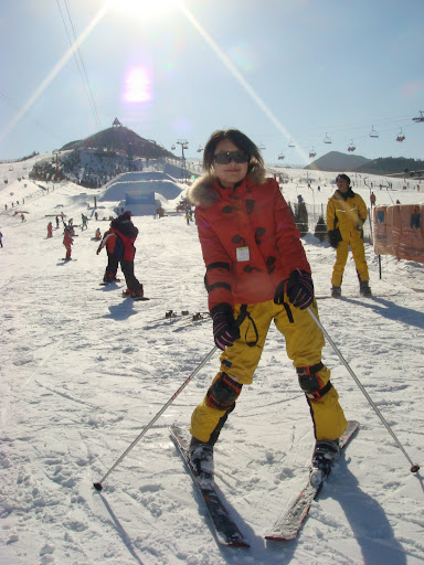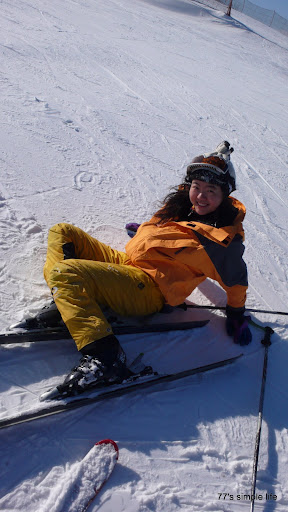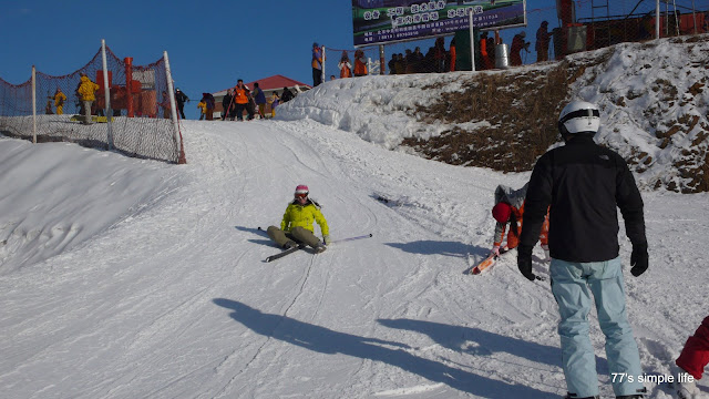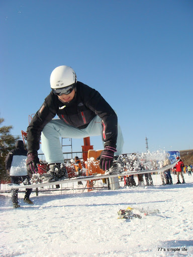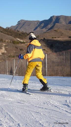 第一天我们在练习道稍作练习之后便转战初级大S道。那条道在山边蜿蜒而下,挺长的一条道,很适合练习。不过我总是在一个陡坡那边摔跤,摔到后来都快有心理障碍了,还没滑到基本就做好摔的准备,结果,当然是不负众望的摔倒。