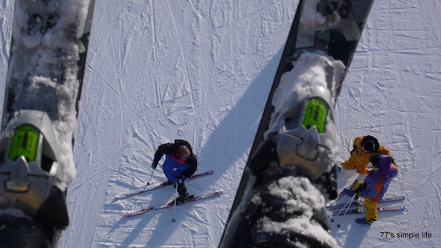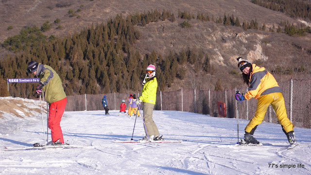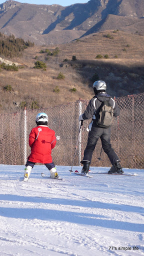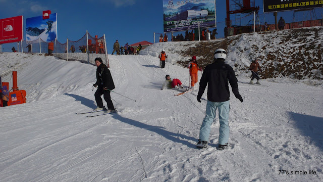 看到最强的小孩是个才两岁的小老外,他爸爸和叔叔带着他在滑。小小的头颅刚到父亲膝盖,简直就是被他老爸夹着在滑。小家伙毫无惧色,实在令我佩服不已。