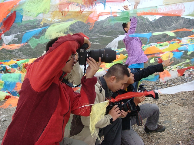 这里有白塔、漫山遍野的经幡、盘旋曲折的公路、落差很大的高原;还有耀眼的眼光、变幻莫测的云彩……一切摄影师喜好的元素。