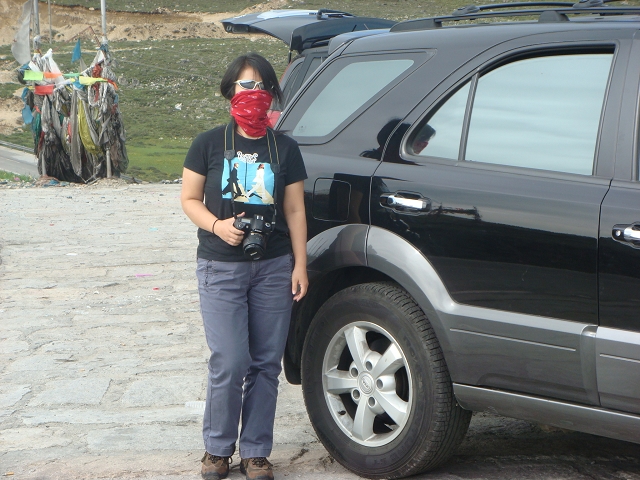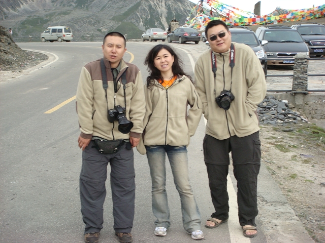 别看照片里面我们穿着短袖,阳光看上去也很明媚的样子,可是同学们啊,那可是海拔4K多米的高原啊!没有高原经验的我不知道会有那么冷,所以没带什么厚的外套,Tony这个号称多年户外经验的家伙居然也忘了这茬事,也没带什么衣服。还好朋友们装备齐全,我们才没被冻僵。