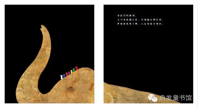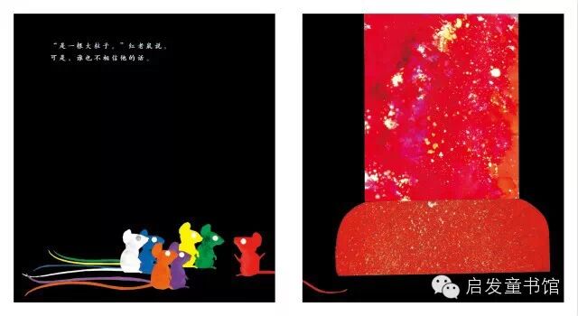 这似乎是“盲人摸象”的一个别致的,更具色彩感和想象力的版本。七只瞎老鼠,各自有一种不同的颜色。他们分别碰到一个奇怪的东西,以自己对色彩和想象力做出了非同寻常的演绎。