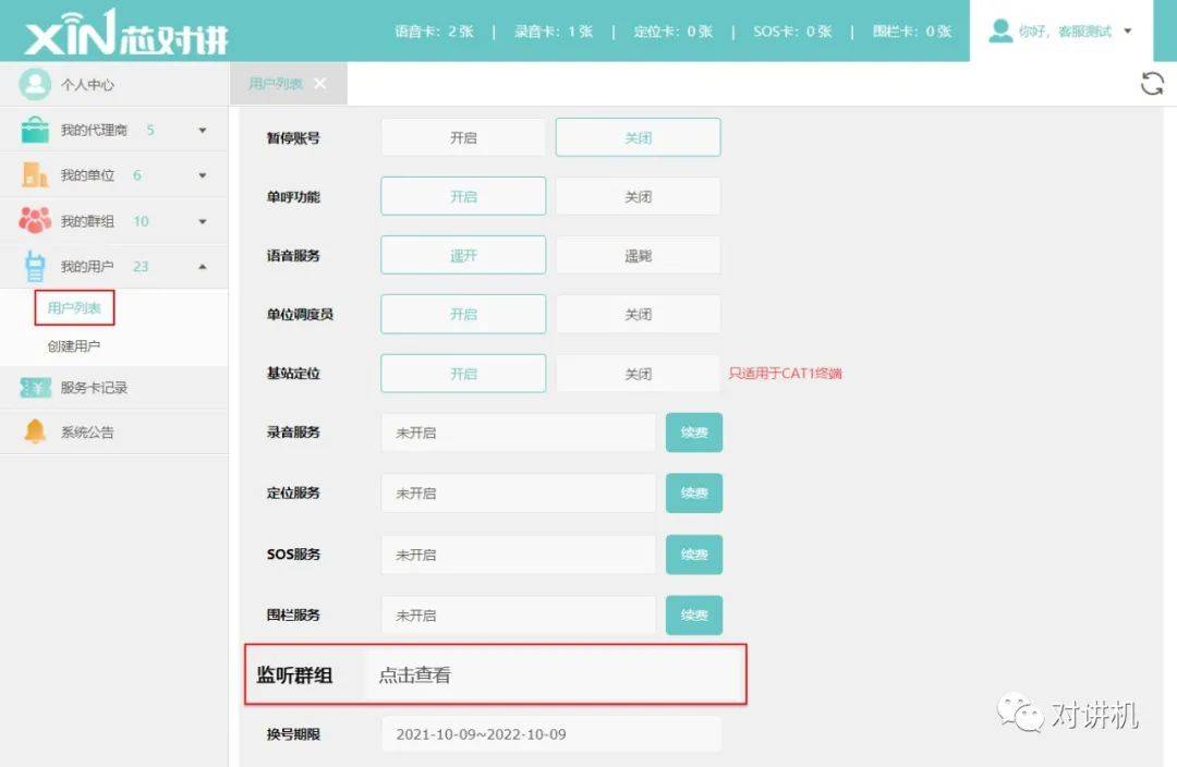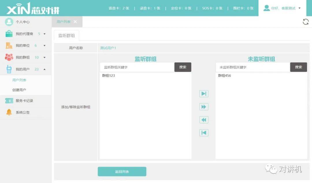 操作:用户列表→编辑用户→监听群组→点击查看可添加或移除监听群组。