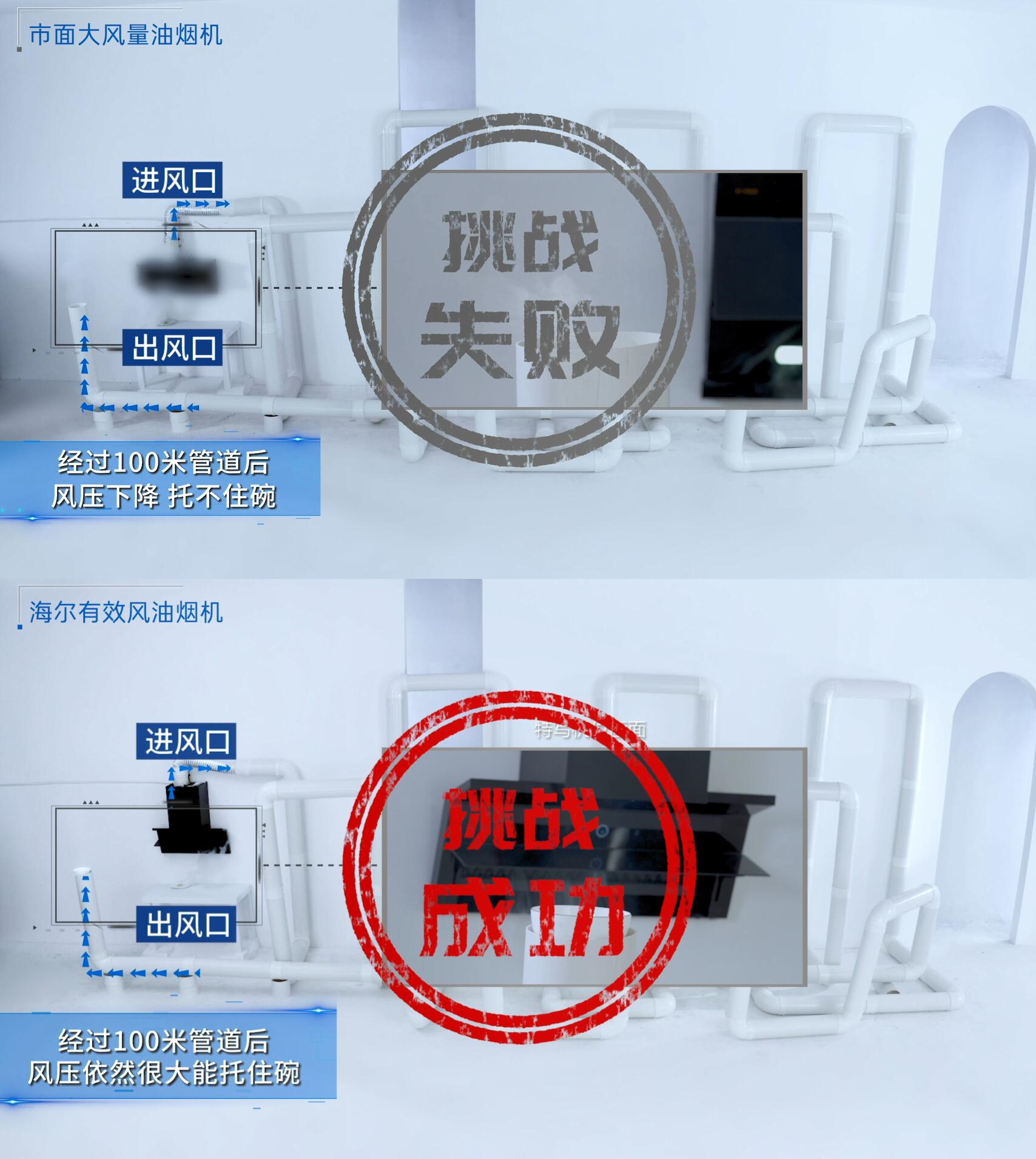 2022年5月13日,海尔发布了一组有效风油烟机的挑战视频,工作人员搭建了100米管道,连接51个弯头,模拟高楼公共烟道排烟环境,市面普通大风量油烟机和海尔有效风油烟机分别参与挑战。其中,海尔有效风油烟机出风口托住了瓷碗,表现更胜一筹。