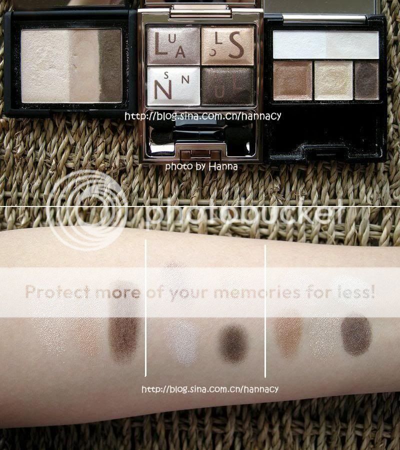 跟另外两盘大地色眼影作对比:左NARS限量三色Calanque(之前写过博文点这里),右Coffret D'or的1代#05(妆文已补,点这里)。