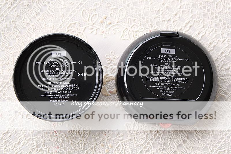 Sonia Rykiel两个新的腮红系列,Gel共三色,Cream共四色。网上功课不多,我决定各入一色,都是01号。区别起见,左边旋盖式的Glowing Gel Blusher称作腮红霜,右边翻盖式的Glowing Cream Blusher称作腮红膏。从质地性状上讲也应当这样区分。