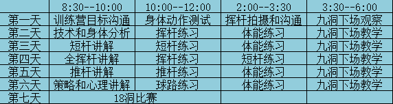 这训练营将从技术、战术、体能、心理等方面齐发力,让朋友们进入从未有过的高尔夫境界!