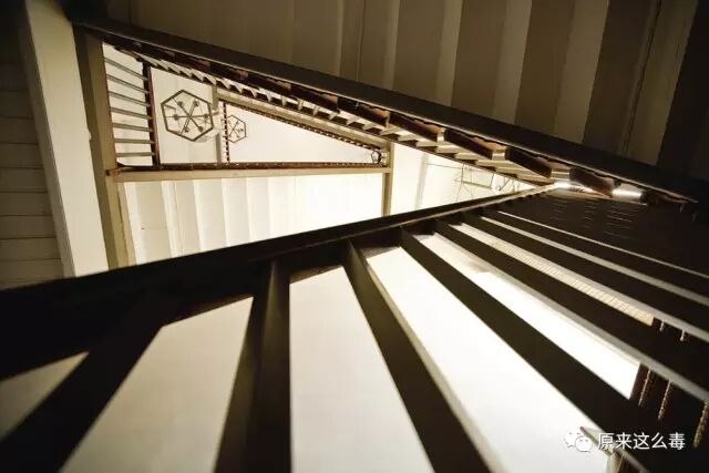 我们来看这张三角形的旋转楼梯。一般旋转楼梯都是从上往下拍比较漂亮,但这个比较特殊,从上往下看很普通,不过换到楼底抬头一看还颇有韵味。三角形与螺旋形比较类似,不过它对线条的控制要求更加高。拍这张照片的时候,我的第一反应是将画面右边的三角形顶点放在画面竖方向的中心点。但是,这样上半部分的楼梯底部颜色太深,会显得头重脚轻。于是我稍微旋转一下画面,让顶点向上走,深色面积减少,它与下方及左边的空间区域力量配比就显得平衡多了。