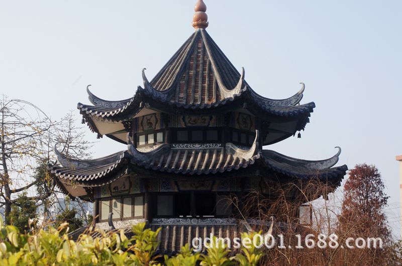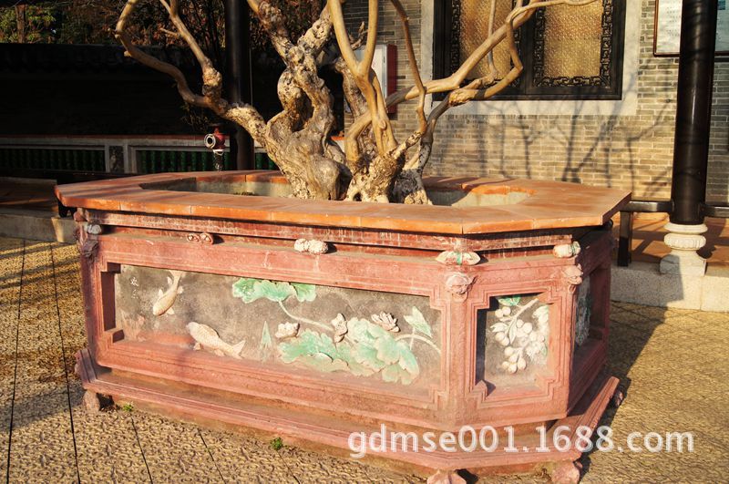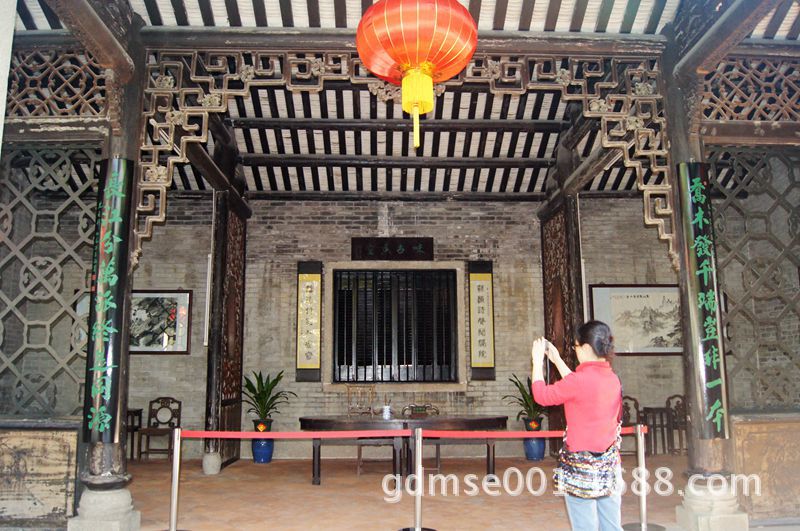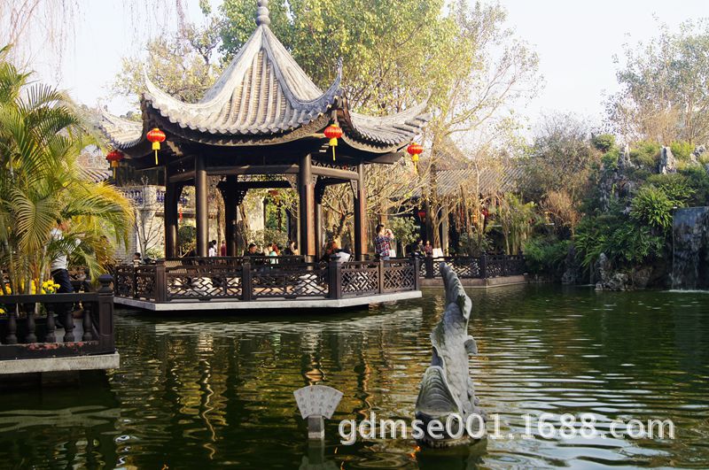 玲珑水榭。这座建筑为八角卷棚歇山顶建筑。窗户八面开启,玲珑通透,又置身水中,故又称玲珑水榭,是园主人邀集骚人墨客挥毫雅叙的地方。因使用功能需要,所以体量较大,反映了岭南园林文化的特点。榭内设八条檐柱四条金柱,均用坤旬木制成,具有很强的观赏性和研究价值。