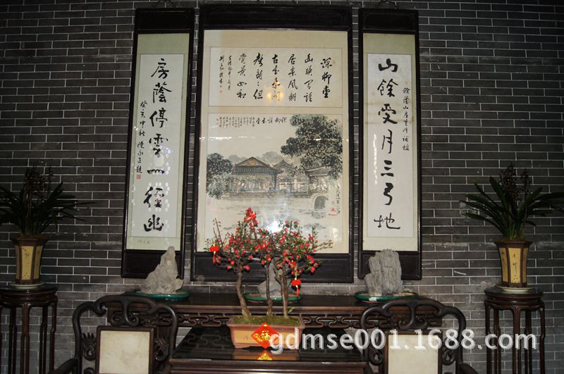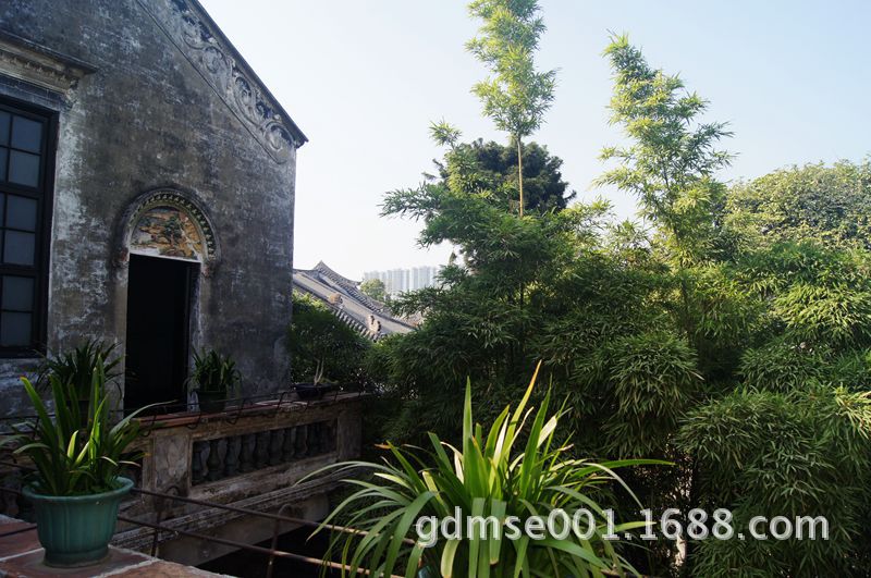 夹墙翠竹。是余荫山房著名绿化景观之一。苏东坡在《咏竹》诗中写到:“宁可食无肉,不可居无竹,无肉使人瘦,无竹令人俗”,点出竹类的崇高地位。中国园林广泛植竹,体现了“雅”的风格。园主将竹子植于两墙之间,不仅经济利用土地,而且表达园主富足之意。并以竹子通直、虚心的风格警示后人,要像竹子那样正直向上,虚怀若竹,才能富足长久。