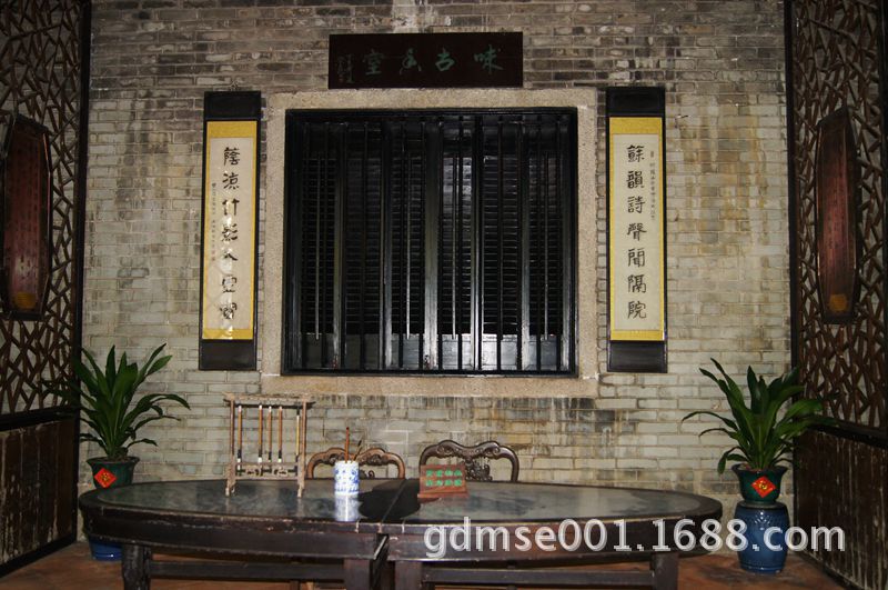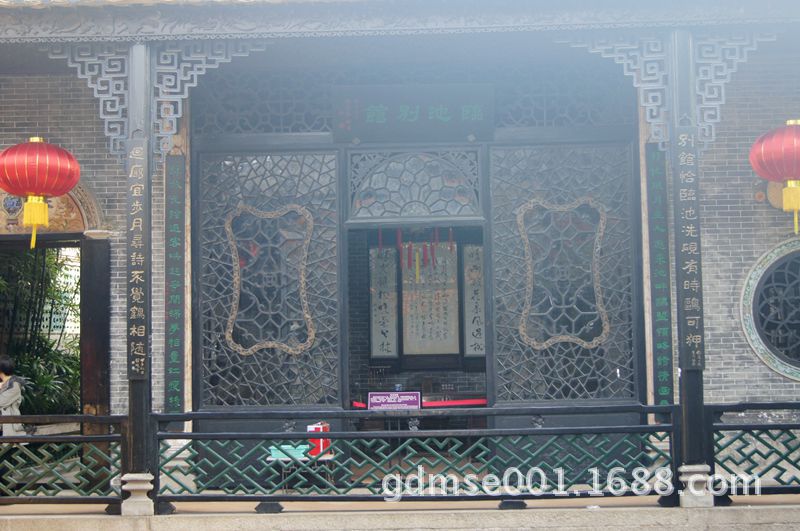临池别馆。原是书斋,为硬山顶建筑,前临四方荷池。古时候的文人雅士以墨砚为“池”, 蘸砚挥毫称为“临池”。因此用“临池”来命名这馆舍真是精妙绝伦。馆内朴素简洁,与深柳堂形成鲜明对照。外观新颖,明间以细密的冰纹花隔断涂金假窗装饰。为适应岭南地区台风频袭的特点,屋顶不陡,屋面线平直,以减少受风面,建筑形象简朴中显出典雅。廊檐柱联:“别馆恰临池洗砚有时鸥可狎,回廊移步月寻诗不觉鹤相随”。