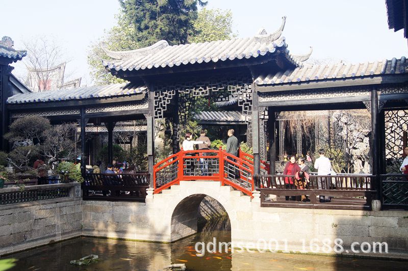 浣红跨绿廊桥。是岭南园林最经典的造型,桥廊高于堤廊,形制歇山。桥廊全场只有20米,将桥、廊、亭、栏巧妙地构成一体,十分精致。水中睡莲平卧,半圆拱桥,回光倒影恰似正圆,堪称静态美的典范。廊桥飞架南北,将园景分成东西两部分,西片红雨,东片绿云。建筑物绕池而建,突出了以水为中心的园林布局。