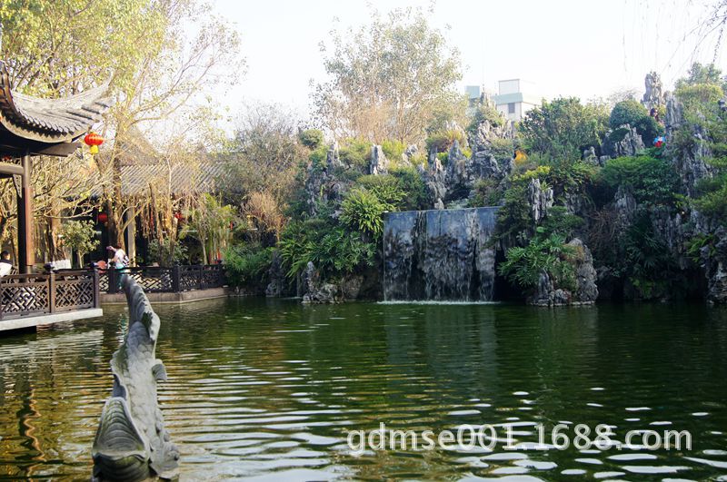 深柳堂。深柳堂是园主会客之所,取名源自唐诗“闲门向山路,深柳读书堂”,它是余荫山房主体建筑,形制歇山,堂外开阔檐廊和庭阶直透池面,外表华丽,内部装饰精细,富有岭南建筑的风格特色。夏日,池中荷花盛开,田田荷叶,翠盖红裳。与装饰华丽的深柳堂相互辉映,景色分外妖娆。