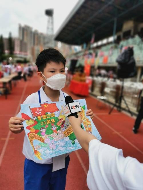 当天还进行“五光十色 东方之珠”龙珠绘画比赛颁奖,大会共收到来自25所学校的125幅参赛作品,25份获奖作品全部临摹制作在25条祥龙的25颗彩珠上。作品中有年轻人手持国旗、区旗和“永远盛开的紫荆花”的构图;有市民普天同庆、万里长城、火箭升空等景象,表达了“一国两制”新阶段香港青少年喜迎回归的精神风貌,也展现了新阶段香港青少年心中的家国情怀。