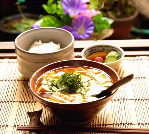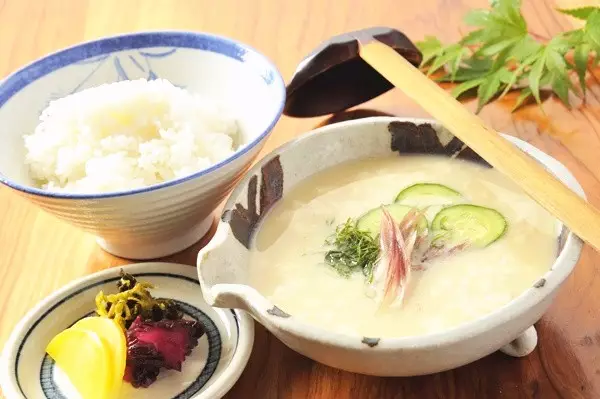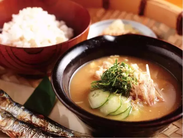 宫崎县乡土料理冷汁是用将烤过的竹荚鱼,沙丁鱼等熟鱼干吊汤,再加入烤过的日式豆酱,加入豆腐,黄瓜,青紫苏等调味,淋在米饭上食用的一道夏季特色料理。虽然看起来比较简单朴素,但是口感非常爽口,还可以增强体力,饮酒后吃也很适合。传说原来宫崎县的农民很忙,为了在工休间能快速地进食,而发明了这道菜。