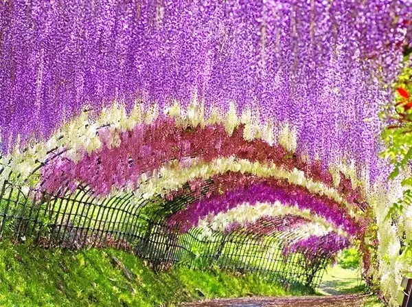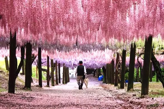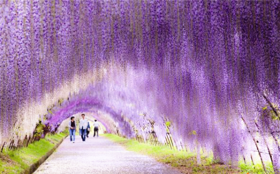 位于九州福冈县的紫藤隧道被称为世界上最美丽的20条街道之一,这里充满着爱丽丝梦游仙境一般如梦如画的视觉效果。各种颜色的花朵与藤蔓点缀于棚顶,把这个隧道衬托得格外美丽与神秘。每年4月末5月初的紫藤季节都吸引了不少爱花之人前来观赏,在欣赏的同时,你的心灵,身体和灵魂都会得到极致的放松。