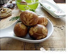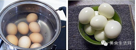 2 煮熟的鸡蛋稍凉后,剥开。我不喜欢用凉水冲,据说那样不卫生。凉后在平板上滚几圈,吧壳碾碎,就很容易整个剥掉了。