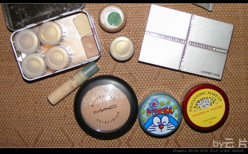 有KP双色遮瑕,PJ的隔离和粉底乳,DOR的粉底液,中草药,GA的粉底,御本木的散粉,米散粉,lunasol的贴肤,面包~