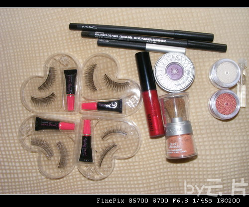 碳晶feline、orpheus、raven半根,KOJI假睫毛四对,MAC唇蜜cult of cherry,UD单色stalker,欧莱雅矿物质腮红70,MAC pigment vanilla、rose,星辰水2ml~