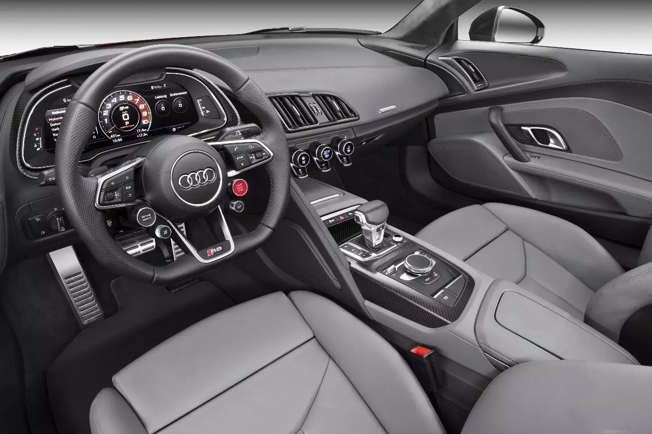 当然全新一代奥迪R8 V10 Coupé Performance的外形一如既往的标新立异,犀利的矩阵型LED灯,宽阔而扁平的蜂窝式一体式进气格栅,让整个车身都很有张力。而内饰的最大亮点毋庸置疑来自于赛车血统的驾驶舱以及奥迪的”虚拟驾驶舱”。奥迪“虚拟驾驶舱”可以根据行车信息需求,在不同的显示模式之间进行快速切换,还可在个性化菜单中根据自己的需要,对显示界面进行调整,这才是未来的感觉。