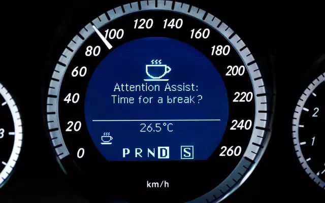 奔驰为了防止驾驶员疲劳驾驶,特地在方向盘内部布置了一个传感器,依据驾驶方式如转向、行驶条件、驾驶时间来评估驾驶人的疲劳程度和注意力分散的情况。如果系统监测到您疲劳驾驶的话,车辆的仪表盘中央就会显示出一个咖啡状的图标,在必要时咖啡杯标志会放大闪烁,并伴有提示音。您该休息了,要想让该图标消失,您需要停车后开车门或重新启动汽车。咖啡……越喝越困……