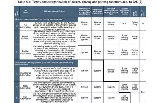 美国国家公路交通安全管理局(简称NHTSA)为自动驾驶进行了分级和详细注释,共分为5个级别,0-4级。