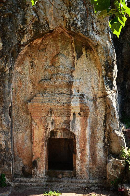 千佛洞石窟在洪谷山内一处谷地的北崖壁上,前临深涧有一处千佛洞石窟,它是塔形龛窟,外部依崖砌筑为方塔形,是将佛教石窟中印度古塔与中国传统木构建筑融为一体,这种继承北齐塔龛遗风的建制,在我国石窟中极为少见。这种方塔造型稳重大方,基石宽厚稳定,檐下叠涩三层,塔刹反叠涩十一层,向上逐层收敛呈现四角攒尖式顶。是研究北朝经隋到唐几代单层方塔演变发展的珍贵资料。