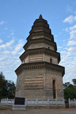 米,通体呈八棱圆锥状。梵塔造型简洁,比例适度,是一座庄严古朴的楼阁式砖塔。塔檐由青砖砌成,塔身周围,每面都有用砖浮雕的佛龛群,约有1